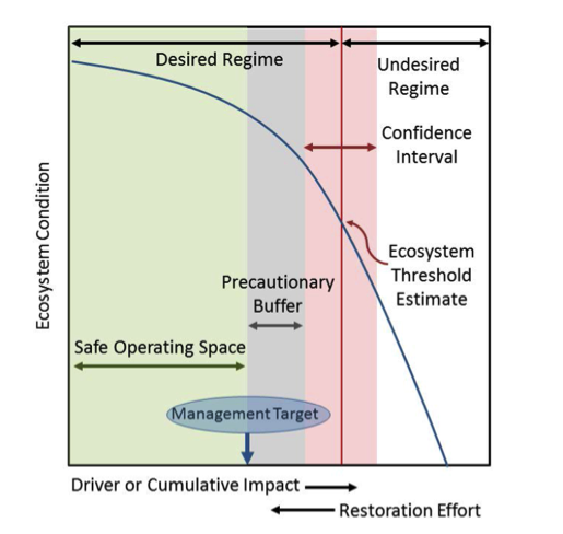Figure 2: Conceptual model for addressing tipping points using management targets. For example, if the desired regime is a healthy kelp forest ecosystem, the management target might focus on maintaining a critical number of otters. Assessments of cost, risk tolerance, and uncertainty around the threshold (confidence interval around ecosystem threshold estimate) guide the width of the precautionary buffer that puts management targets within the safe operating space. To maintain a desired regime, the management target would be a maximum limit of a driver or cumulative impact to avoid an undesirable tipping point. To restore a desired regime, the management target would be a minimum restoration effort required to cause a desirable tipping point response.