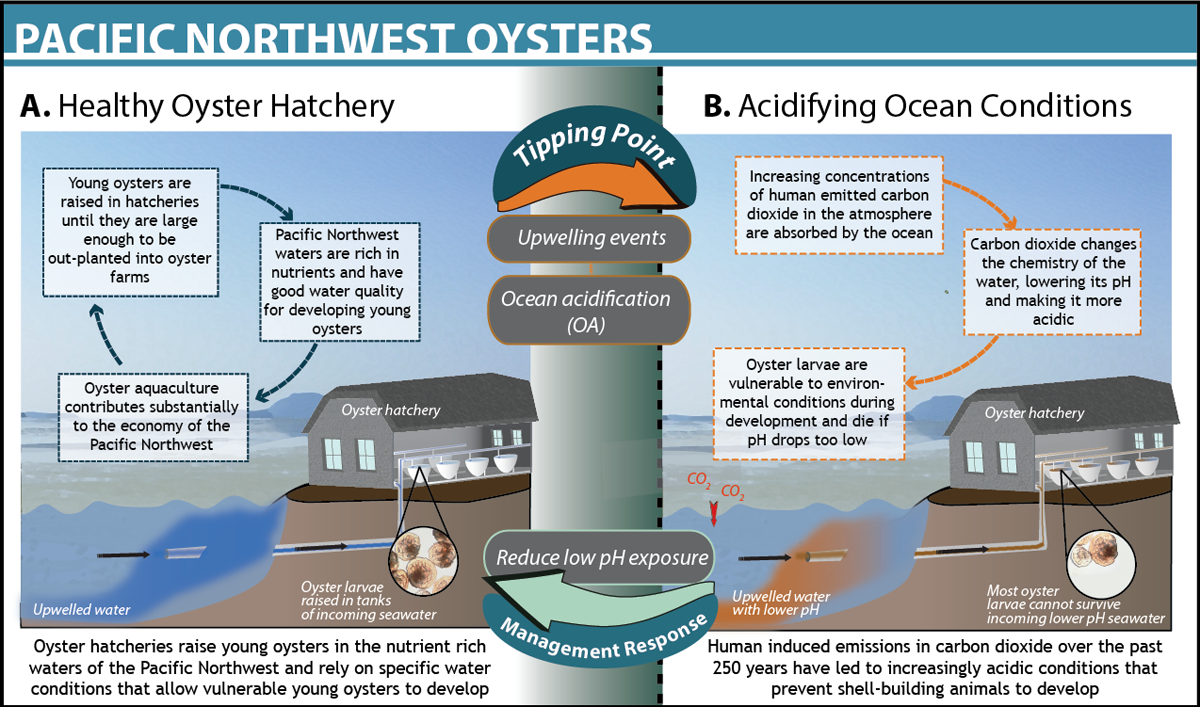 In our study, management of geographically smaller systems had better outcomes in both prospective and retrospective cases. For example, Taylor Shellfish Farms, Inc. in Washington State is a commercial aquaculture facility that grows Pacific oyster spat (Crassostrea gigas). By managing a relatively small system the growers are able to monitor and control important drivers, like pH of the facility’s intake water, that affect oyster growth in non-linear ways (see diagram above).